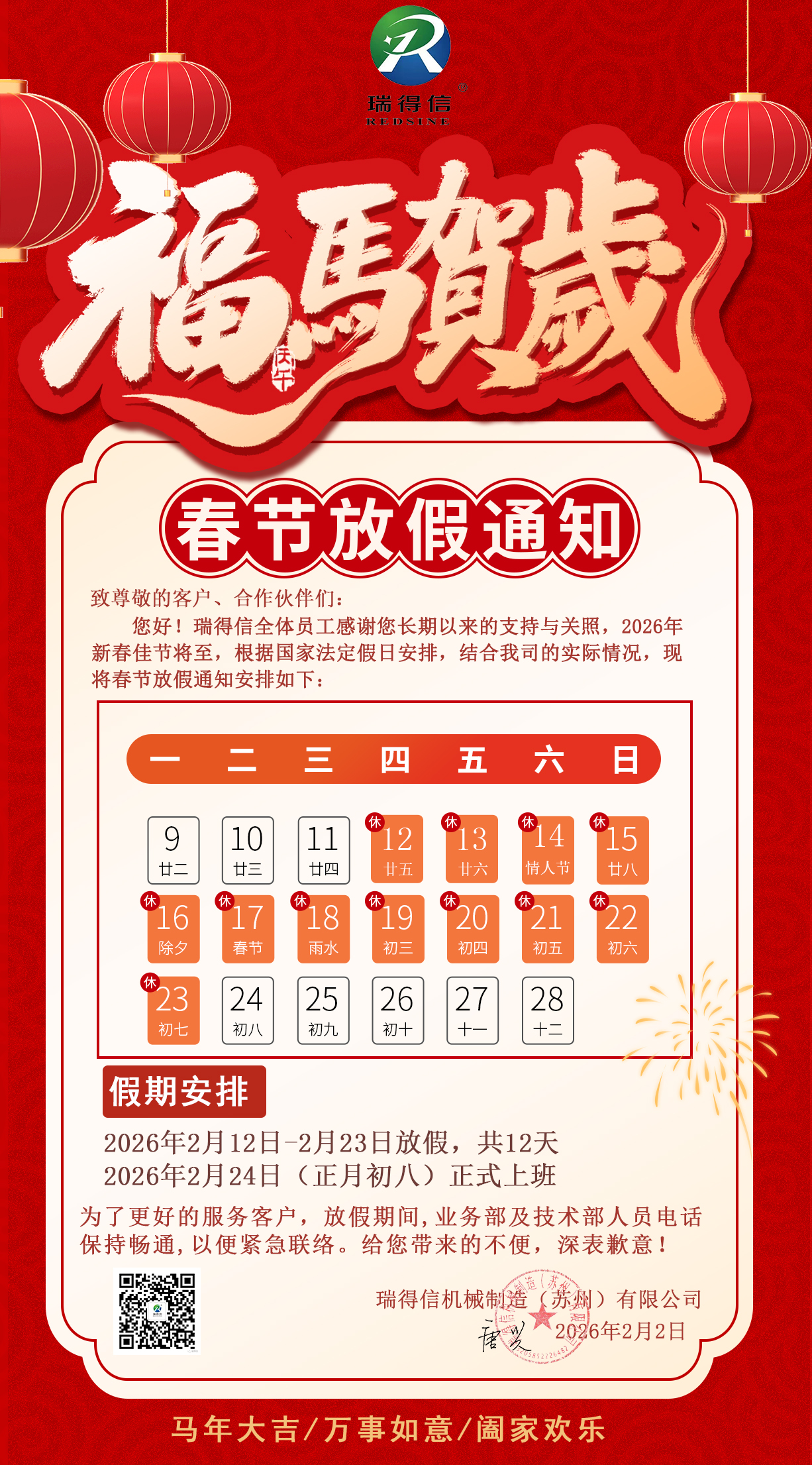 瑞得信恭祝大家2026新春快乐,马年大吉!